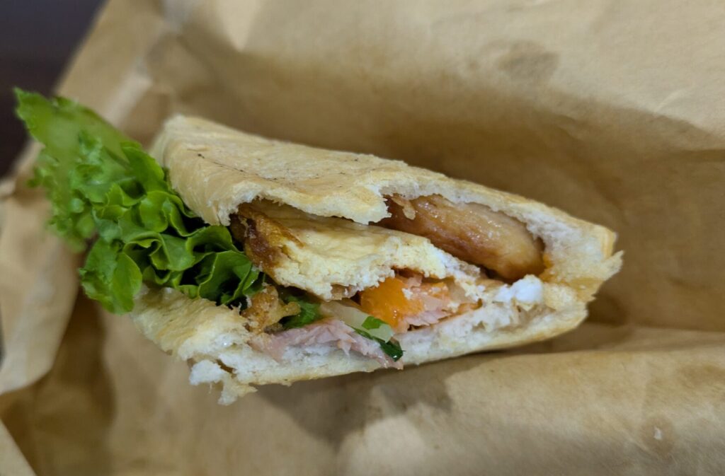 今回注文したのは、メニューの一番はじめに記載されていた「バインミーパテ」(35,000VND)。香ばしいバゲットにパテとハム、さらに新鮮なピクルスと香草がしっかり挟まれている。今回紹介する3店の中では小さめ(そもそも他の店が大きいのか…?)。