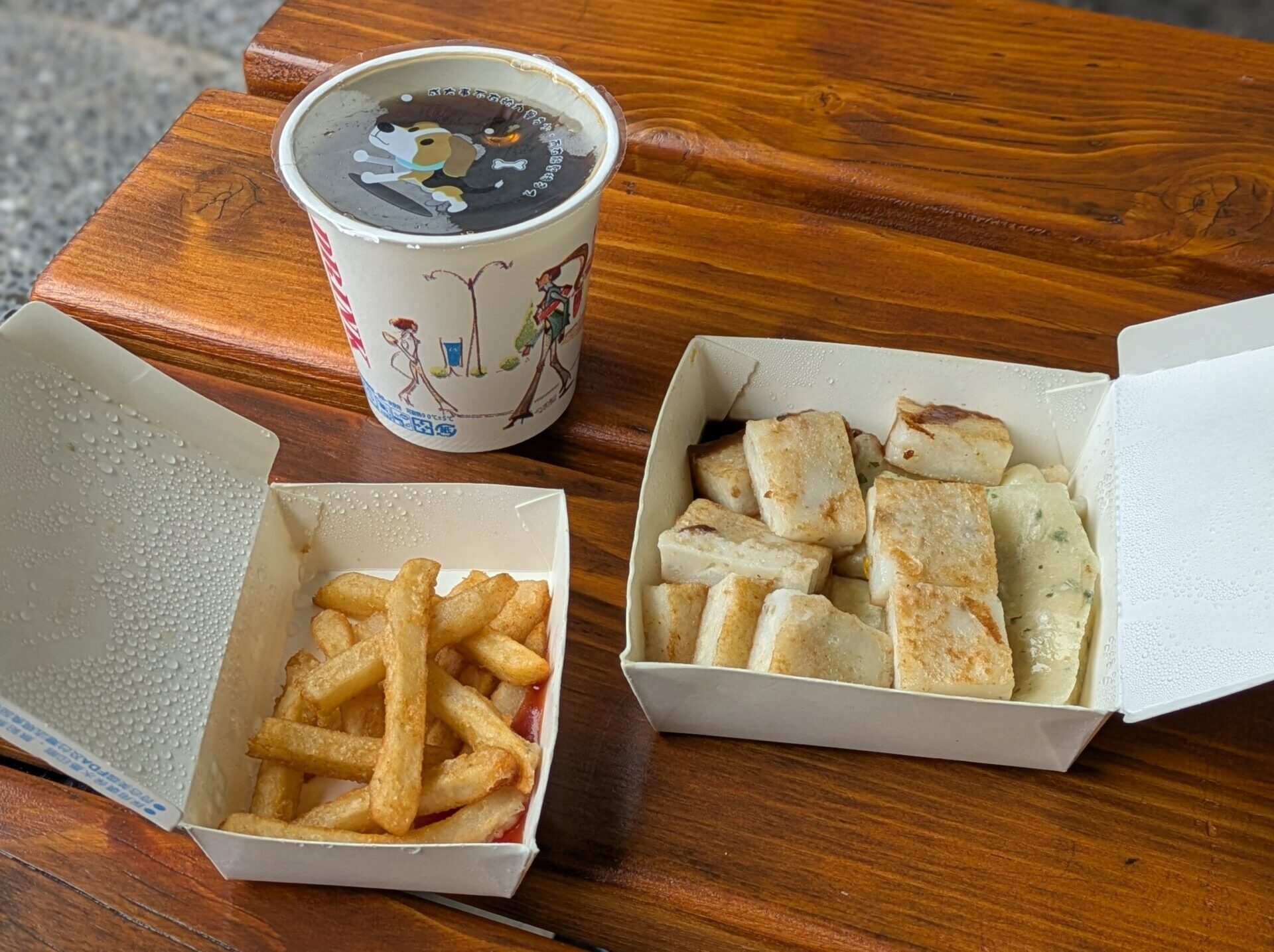 薯條にはケチャップ、蘿蔔糕には甘めのソースがかかっているがクセはないので、日本の人でも食べやすい味付け。もちもちしていて美味しい。
